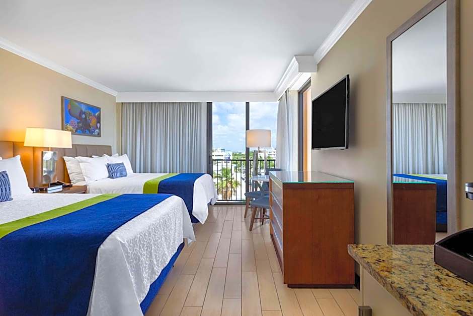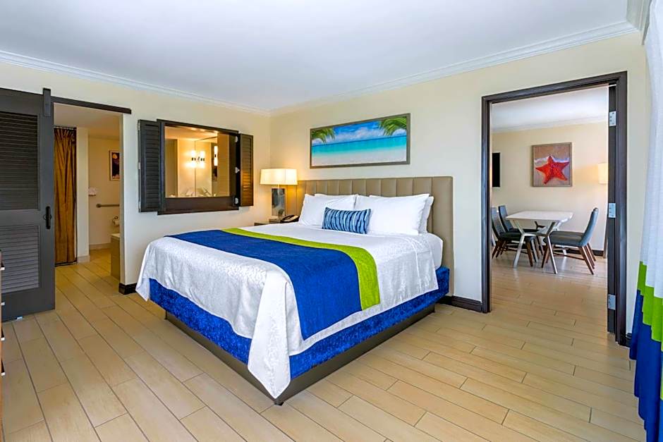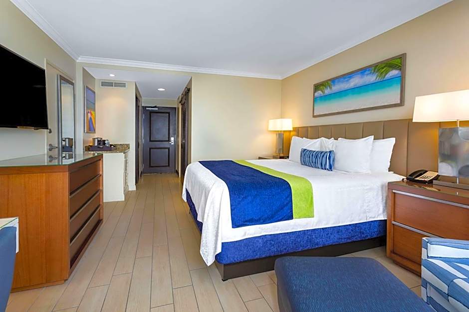 This corner room offers an ocean view and additional space. It includes coffee-making facilities, air conditioning and flat-screen TV. A small refrigerator is also provided.